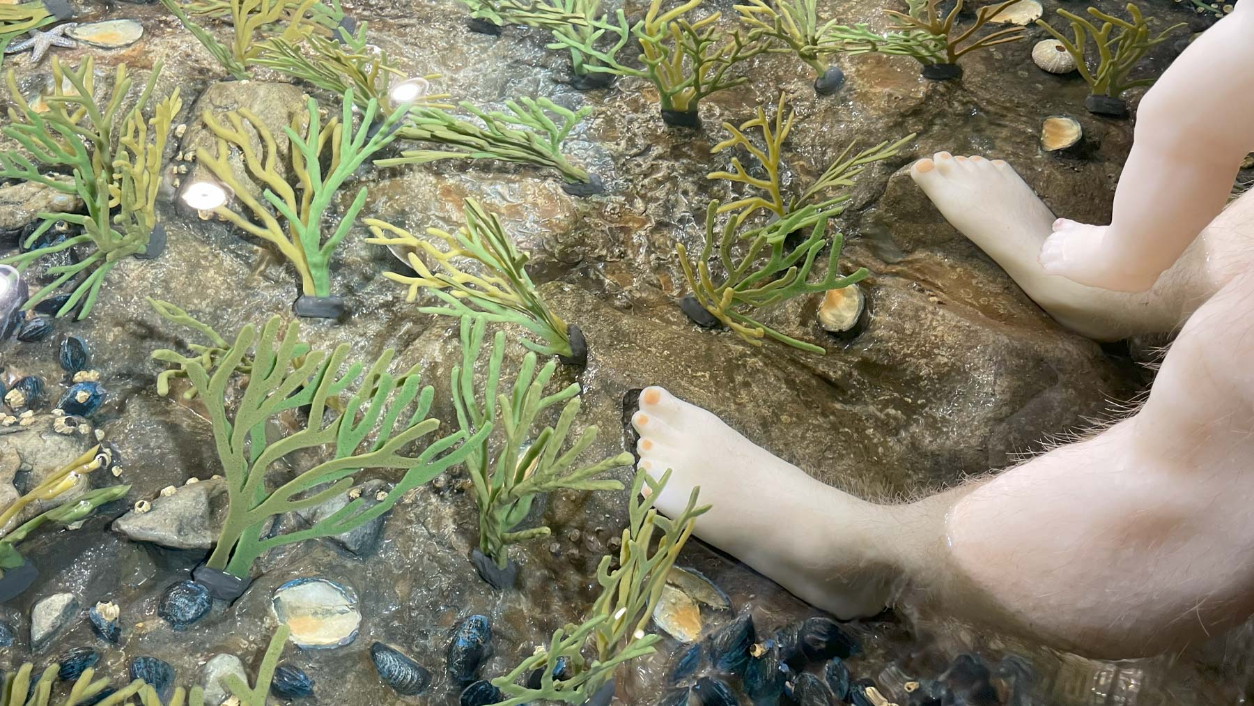 Robert Gober’s Untitled, popularly known as “the suitcase,” holds a great deal more beneath the floor.Those willing to look inside the work find a subterranean pool, where the legs of a man and a young child wade amid seaweed, rocks, and shells. The scene below requires an entire room—the “Gober room”—which Stephanie Cashman, associate conservator of objects, takes us to in a rare, behind-the-scenes tour. Few have the opportunity to visit the room, which requires going down a floor from the galleries before climbing a ladder to the compartment-like room. Because of the tight space and location of the motor that activates the water’s gentle waves, you have to watch where you step once inside. It’s quite an experience!