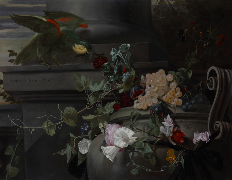 Maria-Theresia Van Thielen, Still Life with Parrot, 1661. Oil on canvas. 21 × 27 in. (53.34 × 68.58 cm) framed: 27 1/2 × 33 3/4 × 3 1/2 in. (69.85 × 85.73 × 8.89 cm). Gift of Mr. and Mrs. John Schroeder in memory of their parents M1967.41